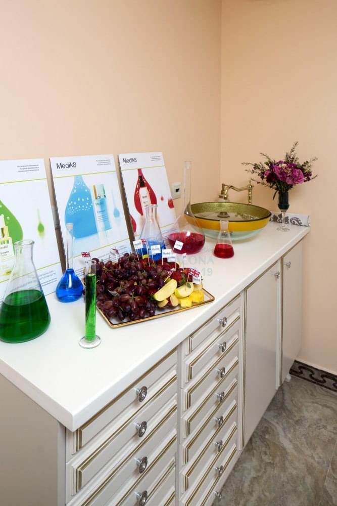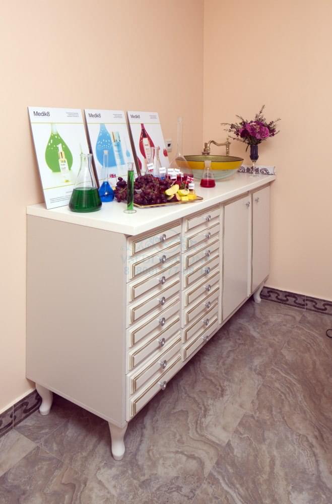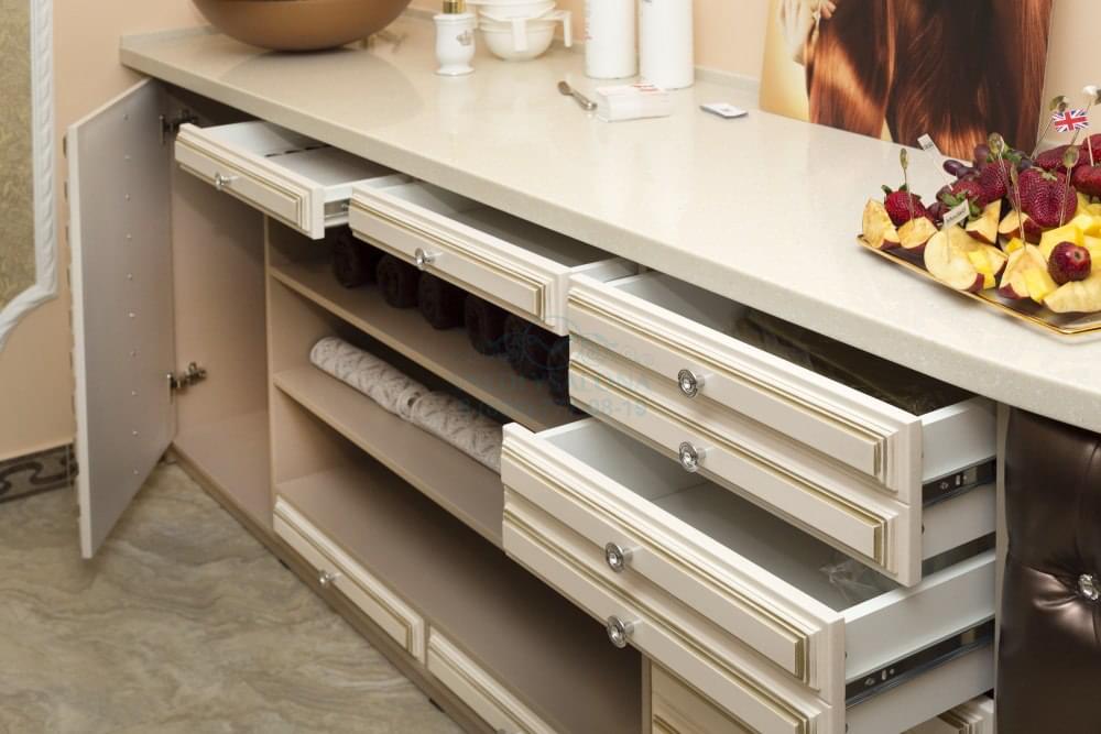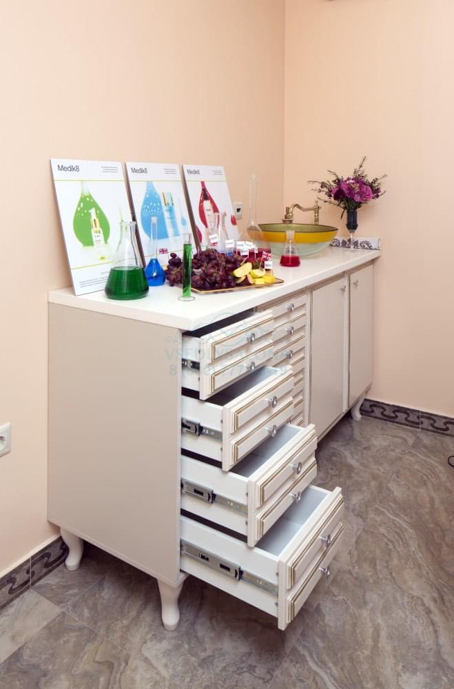 Лаборатория оборудована удобными открытыми полками и выдвижными ящиками