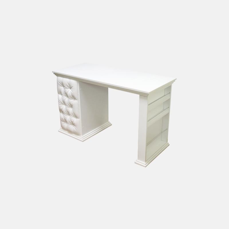 Оригинальная модель маникюрного стола «Доменико» - стильное и практичное решение. Он не просто удобен в работе, но и обладает рядом уникальных особенностей. Одна из главных – боковые полочки для различных лаков и других средство. Такой метод организации пространства не расходует место и позволяет держать под рукой все необходимое в работе.