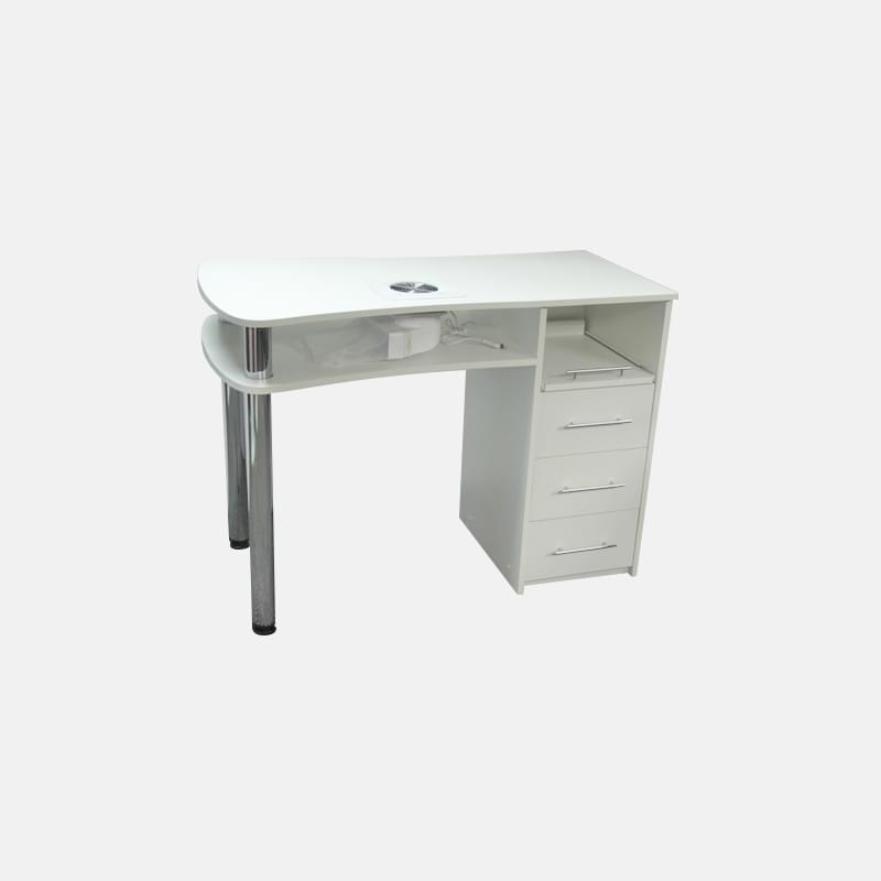 Маникюрный стол «Хирономо» - для тех, кто ищет по-настоящему изысканные решения для своего маникюрного салона или кабинета. Оригинальная форма столешницы, хромированные ножки, вместительная тумба – все это здесь. На нижней полке может быть установлена вытяжка для еще более комфортной работы мастера маникюра.
