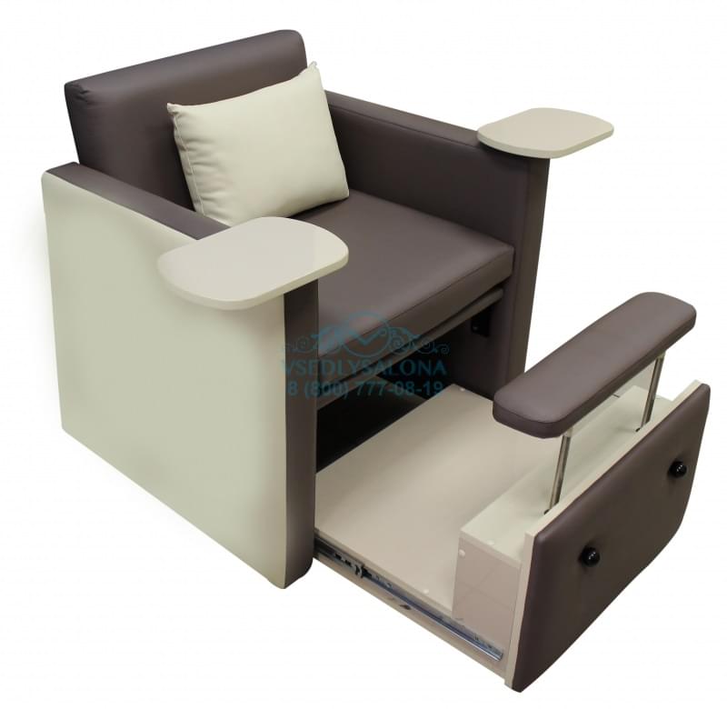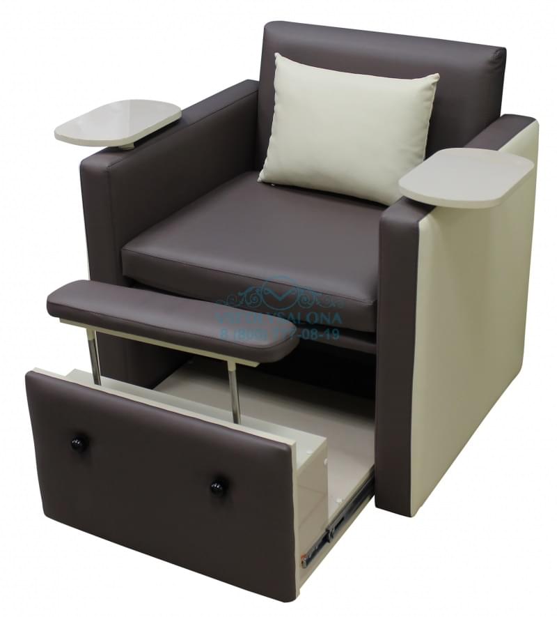 Бюджетным, но не менее красивым и многофункциональным может стать кресло российского производства. СПА кресло имеет крепкое металлическое основание, способное выдерживать большие нагрузки. Есть выдвижная нижняя часть, что является специальной удобной площадкой под ванночку. Обивка выполнена из нежно-бежевой и темно-коричневой прочной и надежной эко кожи. Для удобства клиентов в комплект входит подушка под спину и мягкие вставки в подлокотники с движущимися деревянными пластинами. Педикюрное СПА кресло станет идеальным дополнением вашего СПА салона.