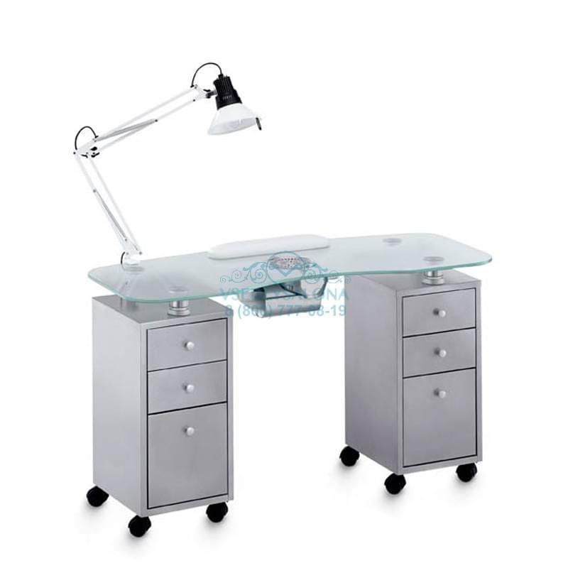 Маникюрный стол с двумя тумбами, столешница из стекла, тумбы из металла с тремя выдвижными ящиками, на колесах. В комплекте: лампа, подушка маникюрная, подставка под лаки, вытяжка AR3 40W.