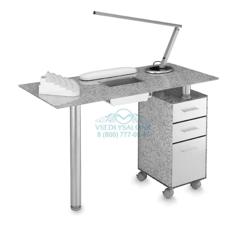 Маникюрный стол с одной тумбой, столешница из стекла, тумба из стекла с тремя выдвижными ящиками из металла, на колесах. В комплекте: лампа, подушка маникюрная, подставка под лаки, вытяжка AR5 Superturbo 80W.