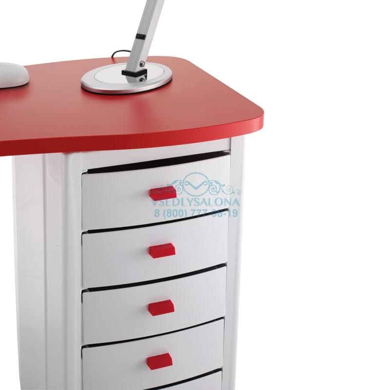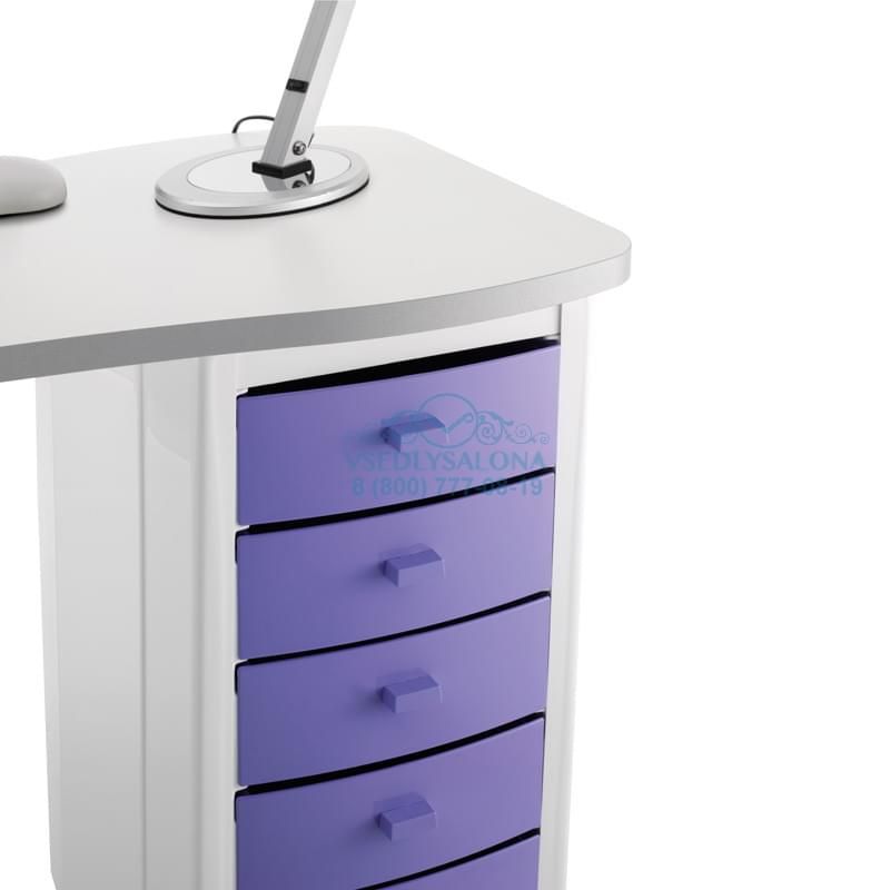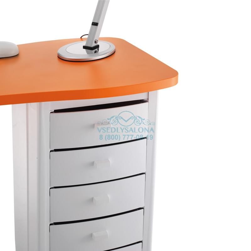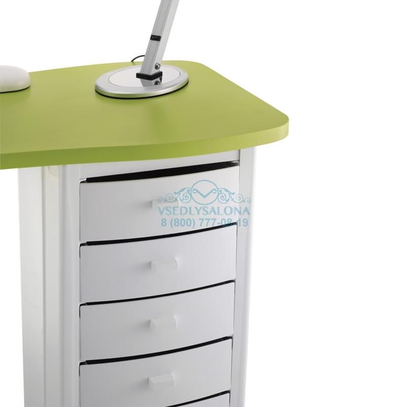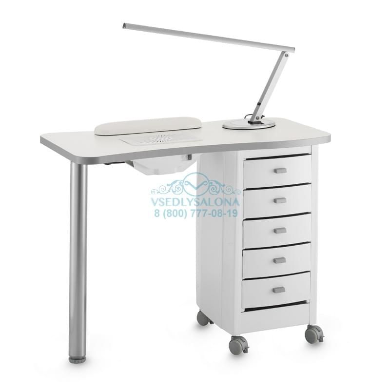 Маникюрный стол с одной тумбой, столешница ламинированная, тумба пластиковая с выдвижными ящиками, на колесах. В комплекте: лампа, подушка маникюрная, подставка под лаки, вытяжка AR1 20W.