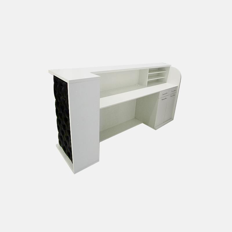Со стороны персонала стойка имеет просторную столешницу на которой располагается три открытых полки. Под столешницей располагается тумба с двумя выдвижными ящиками и двумя шкафчиками с распашными дверцами. Тумбу и полки можно разместить с левой или с правой стороны. Под заказ возможно изготовление по индивидуальным размерам и в любом цвете ДСП и искусственной кожи.