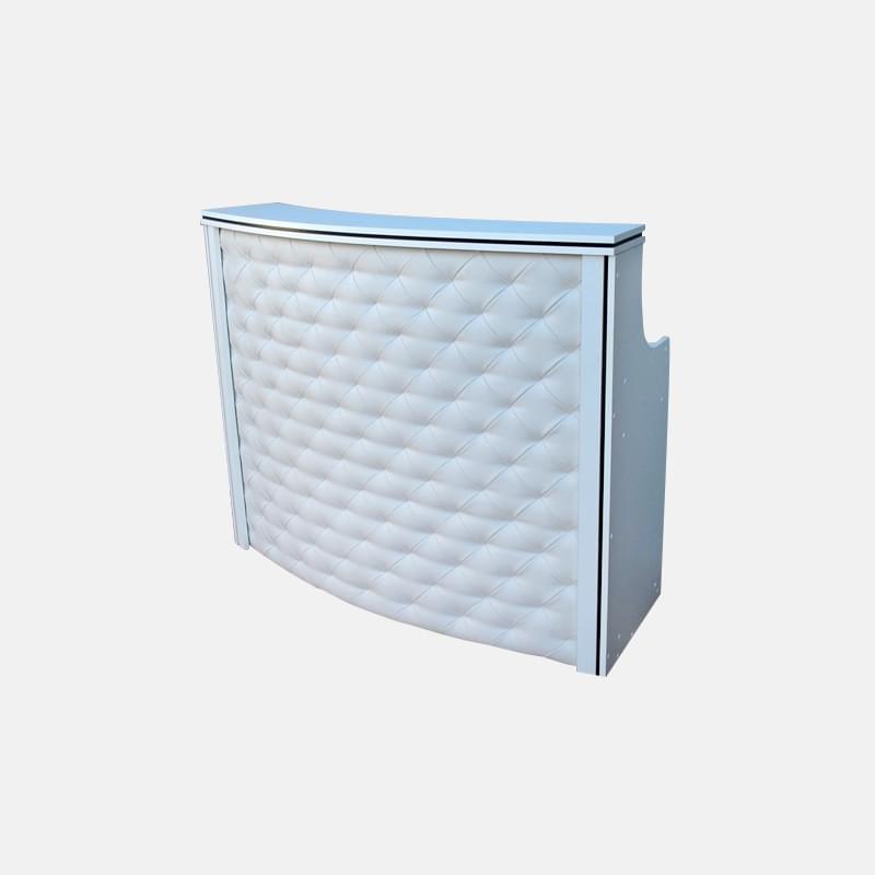 Полукруглый ресепшен выполнен в бело-голубых оттенках из ЛДСП и кожи высокого качества, главная особенность модели – картечная стяжка, при помощи которой создается классический, универсальный стиль. Такую ресепшен легко чистить, поэтому и прослужит она ни один год!