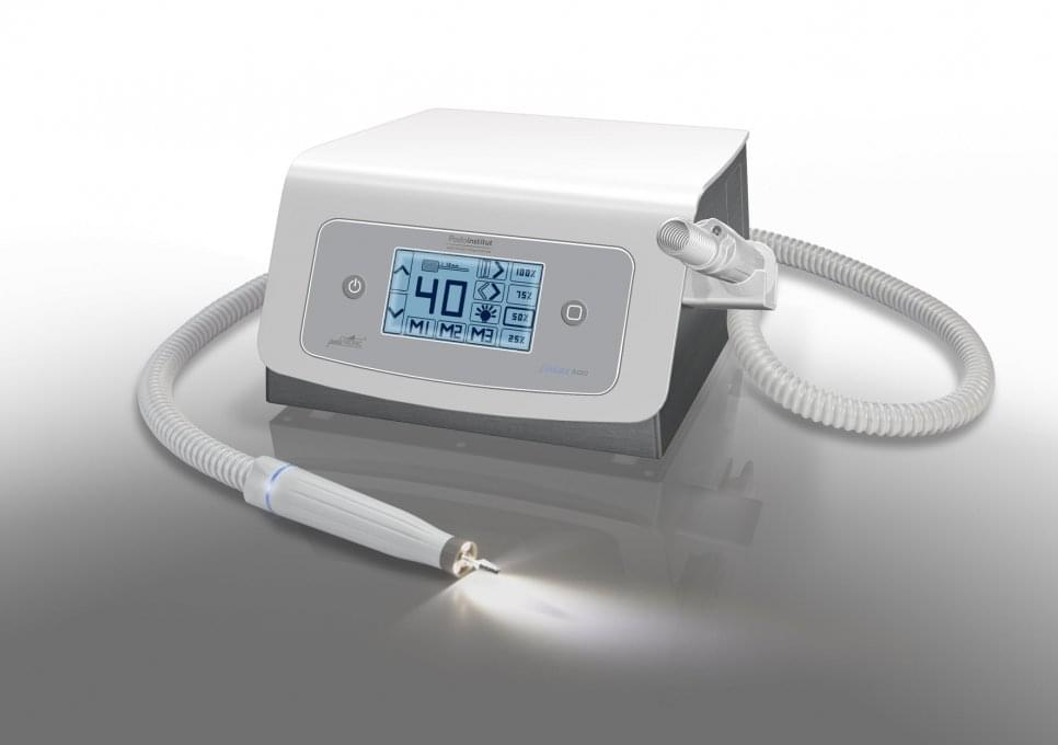 Аппарат оборудован усовершенствованным встроенным пылесосом и эргономичным наконечником со встроенной LED подсветкой с тремя светодиодами. Модель оснащена тремя настраиваемыми ячейками памяти для быстрого перехода к собственным настройкам скорости вращения фрезы и мощности всасывания пылесоса. Все настройки педикюрного аппарата регулируются при помощи сенсорного дисплея на лицевой панели.
