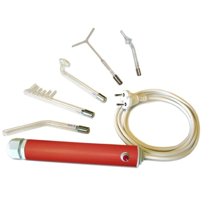 В комплект аппарата для дарсонвализации входит 5 электродов, следующих видов: грибок, расческу, изогнутую палочку, ушной и спинной электрод-рогатку.
