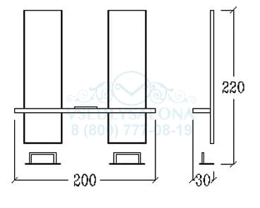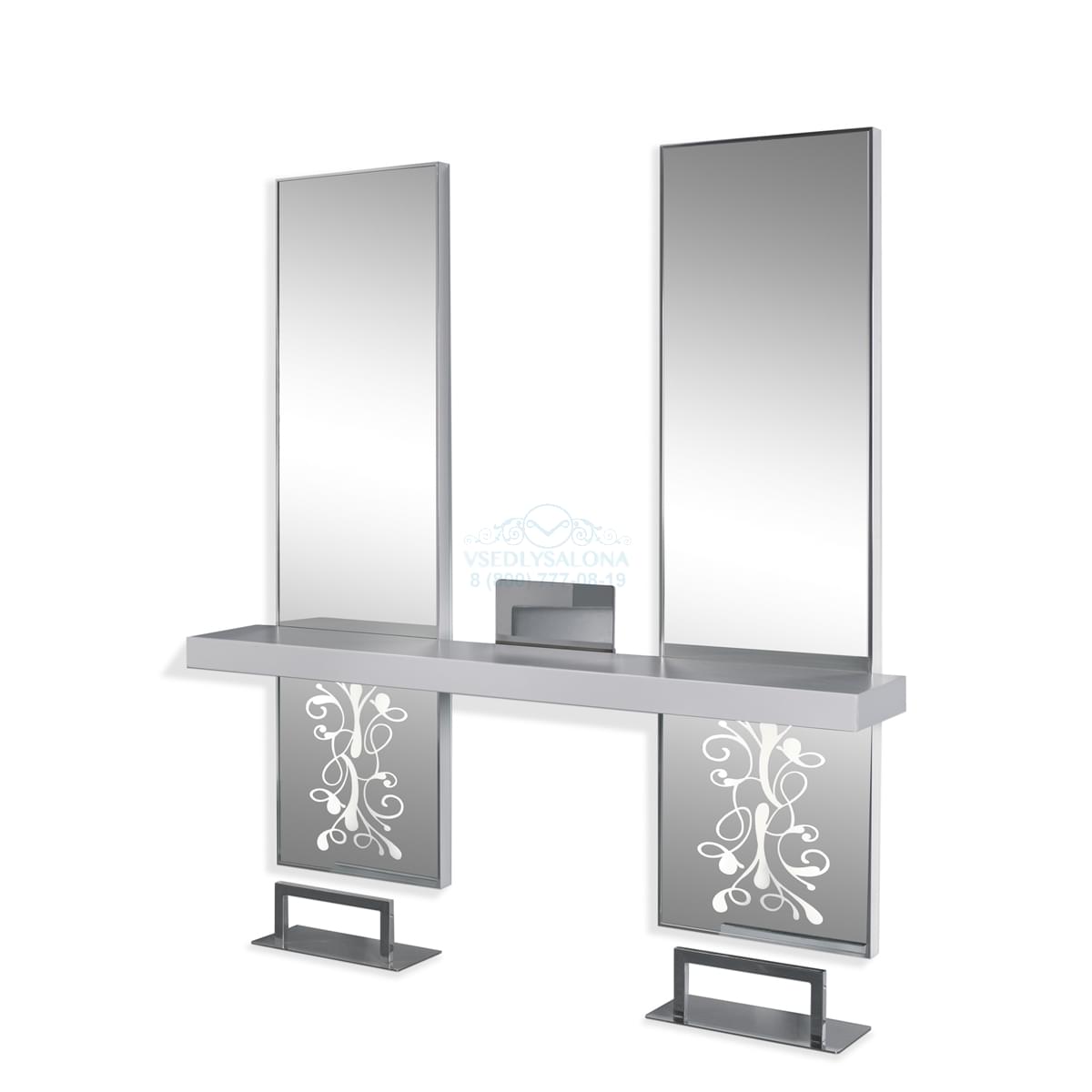 Двойное настенное рабочее место мастера, объединенное одной полкой из выкрашенного дерева. Высокие зеркала в алюминевой раме, световая инкрустация в нижней части. Подножка металл. Размер:200х30х220