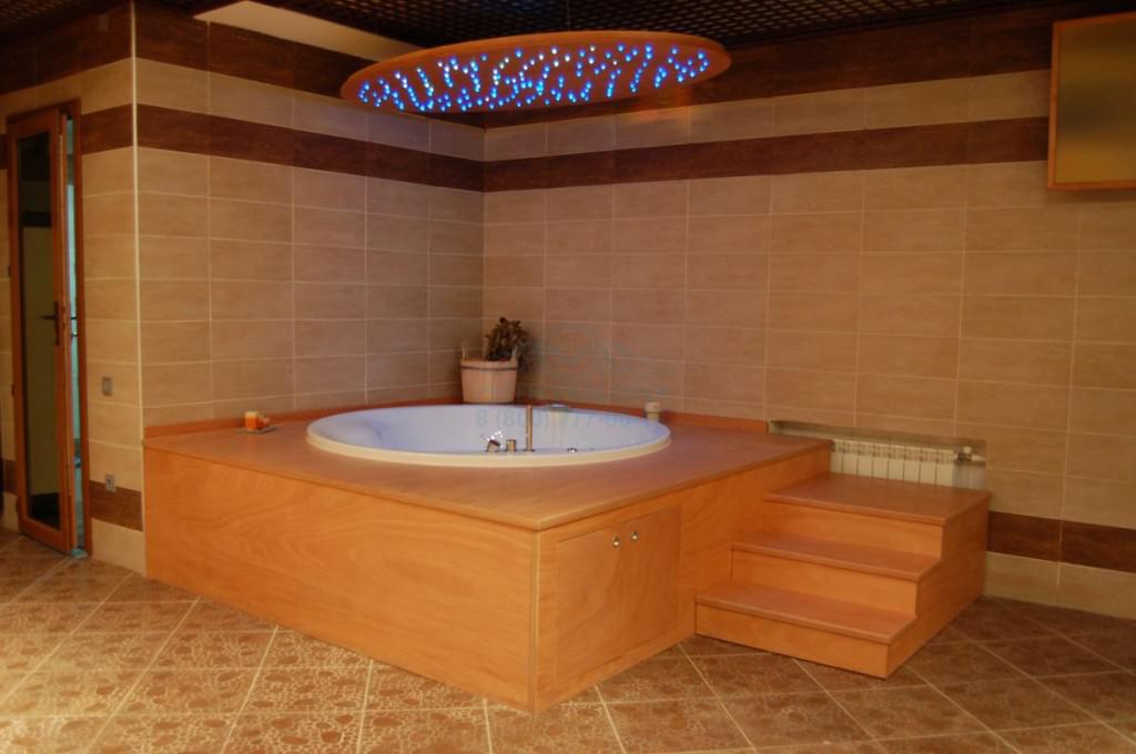 Одноместная гидромассажная ванна из акрила с деревянным подиумом и функцией хромотерапии.