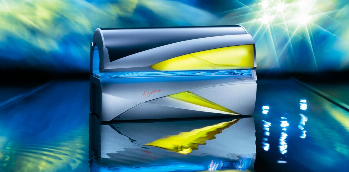 Прогресс в чистом виде - новые горизонтальные солярии Ergoline Affinity - изумительно красивые и притягивающие внешне, комфортные внутри. Разнообразие моделей так широко, что Вы подберёте подходящий именно Вам по мощности и комплектации идеальный солярий. Потребляемая мощность 7 800 Вт - 500 Super Power c охлаждением, 20 100 Вт - 950 Ultra Power с охлаждением. • 43 -50 ламп от 100 до 180 Вт, 3-4 лампы до 520 Вт для загара лица. • Эргономичное стекло, плавно повторяющее контуры тела Body Shape, позволяет полностью расслабиться во время сеанса загара. • Плавнорегулируемая система вентиляции Comfort Cooling. • Система климат-контроля Climatronic* поддерживает заданную температуру во время сеанса загара, приятно окутывая всё тело прохладными потоками воздуха. • Освежающие комфорт-программы Aqua Fresh и Aroma. • Абсолютно новое качественное звучание с музыкальной системой 3D-Sound*. • MP3 разъём*, SD-Card-Slot*. • Встроенная функция голосовых инструкций Voice Guide* позволяет загорающему получать немедленную информацию о каждой новой ситуации и о каждом только что сделанном шаге в процессе управления солярием. Дополнительные опции