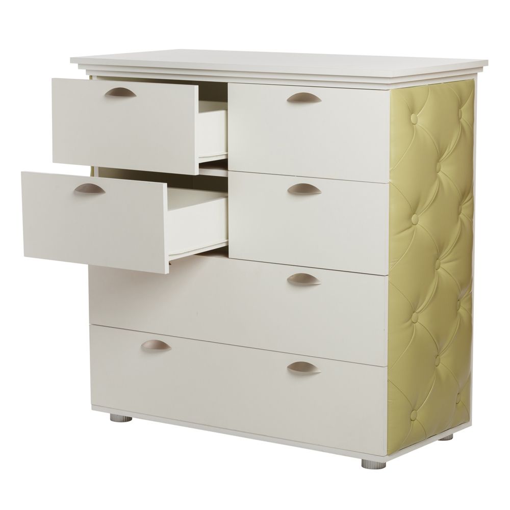 Комод выполнен в виде тумбочки с пятью выдвижными ящиками.