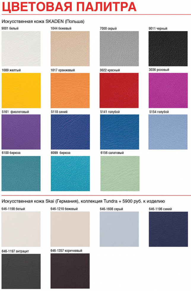 Каркас кресла изготовлен из стальной профильной трубы с порошковым полимерным покрытием, устойчивым к ударам, сколам и к обработке всеми видами дезинфицирующих растворов. Мягкие элементы выполнены из водостойкой фанеры, поролона, покрыты искусственной кожей, устойчивой к истиранию, химическим дезинфектантам и УФ-излучению. Цвет обивки – по желанию заказчика.