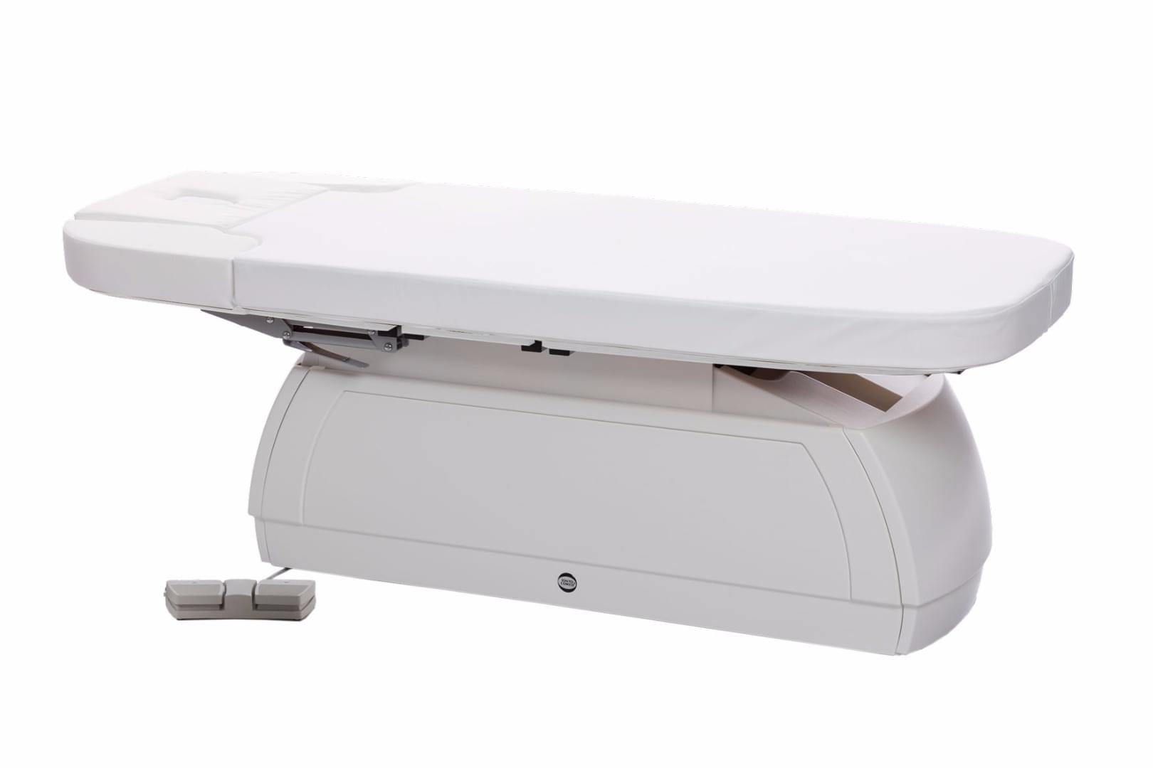 Горизонтальный матрац с сегментной разбивкой головной части, что делает процедуру массажа комфортной благодаря прорези для носа и опускаемым подлокотникам.