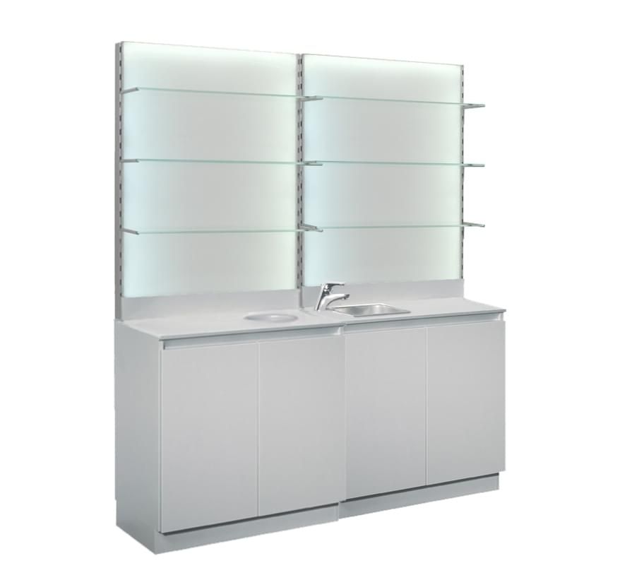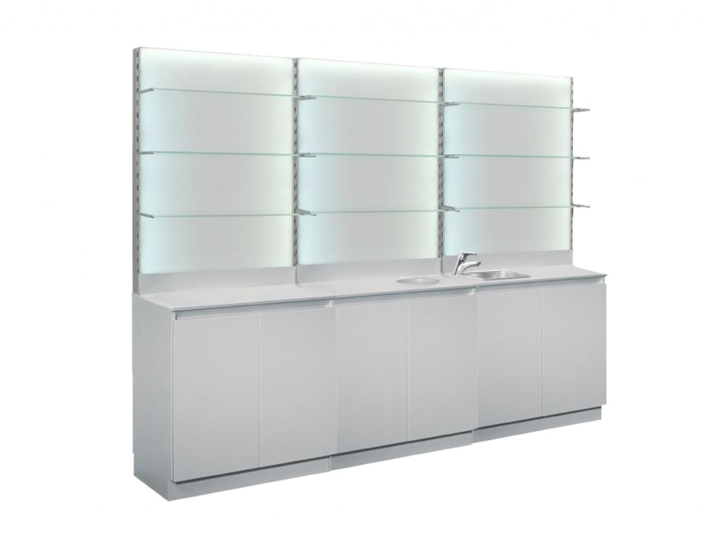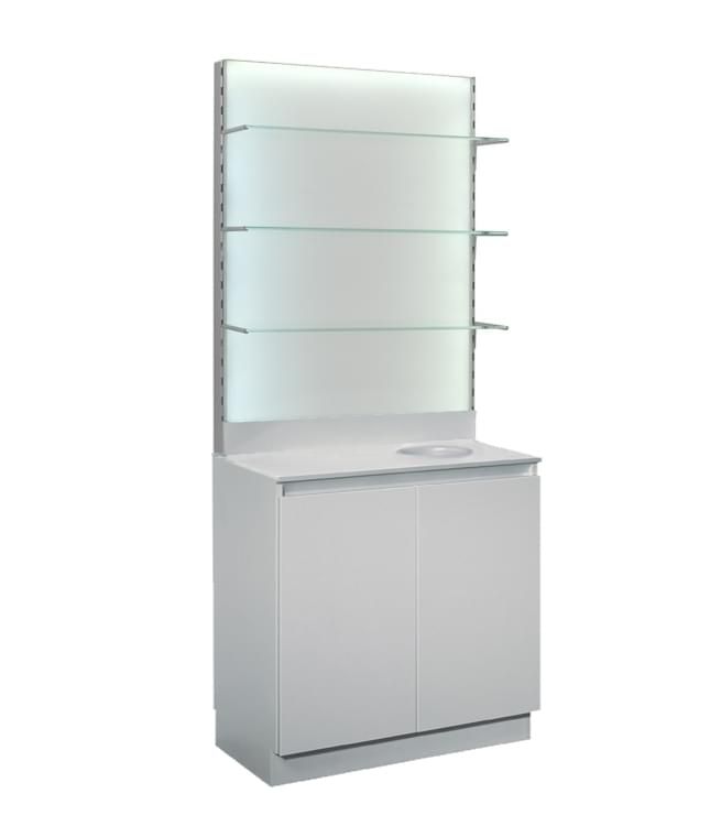 верхний бокс с фоновой подсветкой полки из прозрачного стекла на кронштейнах с возможностью перестановки по высоте кольцо и накопитель для сбора использованных полотенец