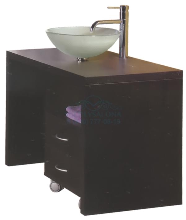 Лабортория выполнена из дерева цвета венге. Имеет выкатную тумбу с ящиками и стеклянную раковину со смесителем.