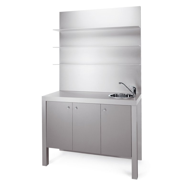 Лаборатория из дерева и алюминия с раковиной и смесителем.