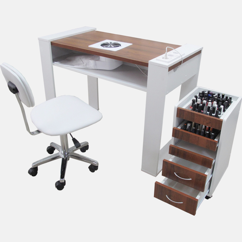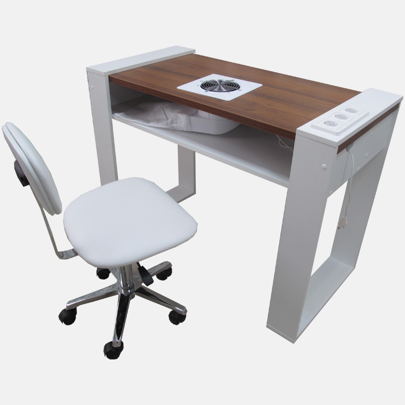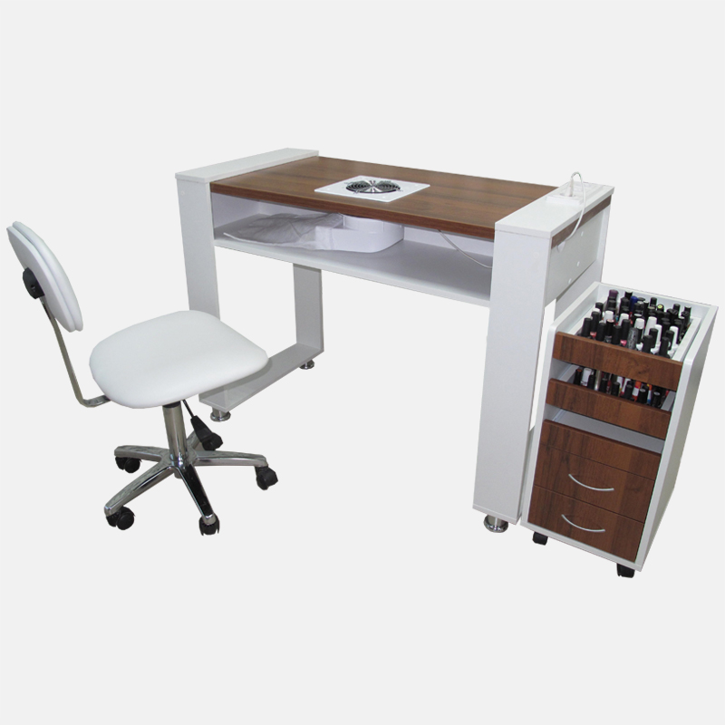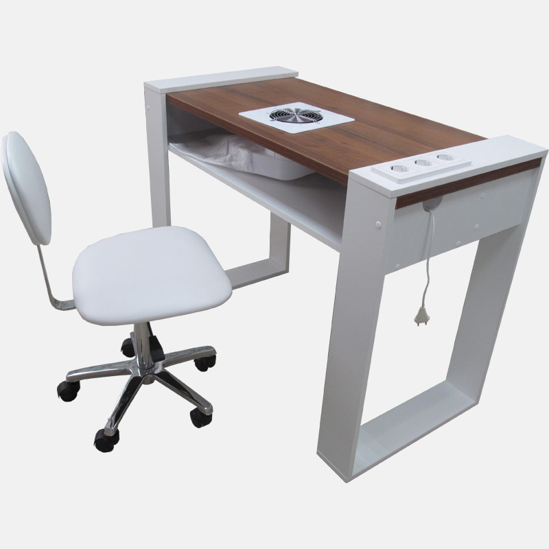 Маникюрный стол «Хирономо» - для тех, кто ищет по-настоящему изысканные решения для своего маникюрного салона или кабинета. Оригинальная форма столешницы, хромированные ножки, вместительная тумба – все это здесь. На нижней полке может быть установлена вытяжка для еще более комфортной работы мастера маникюра.