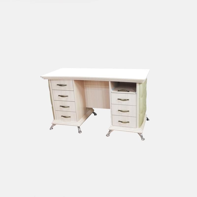 Две тумбы с выдвижными ящиками позволяют разместить здесь все, что только может понадобиться для работы. Если для вас важна практичность в паре с эксклюзивным дизайном, обязательно рассмотрите данный вариант. Плюс здесь можно выбрать цвет каретной стяжки и остальных элементов по своему усмотрению.