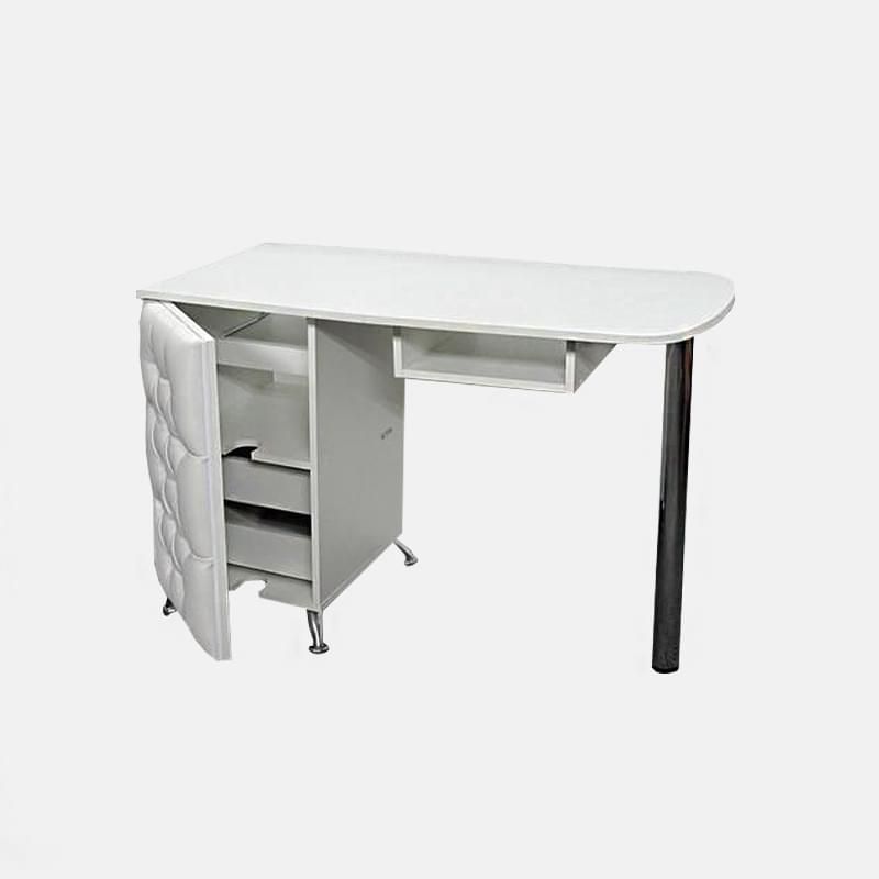 Представляем вашему вниманию компактный и практичный в эксплуатации маникюрный стол Drag. Его главные преимущества – небольшие габариты, легкость и привлекательный современный дизайн. Столешница небольшая по площади, но удобная в работе. В тумбе за дверкой с каретной стяжкой – несколько полочек для инструментов и различных средств.