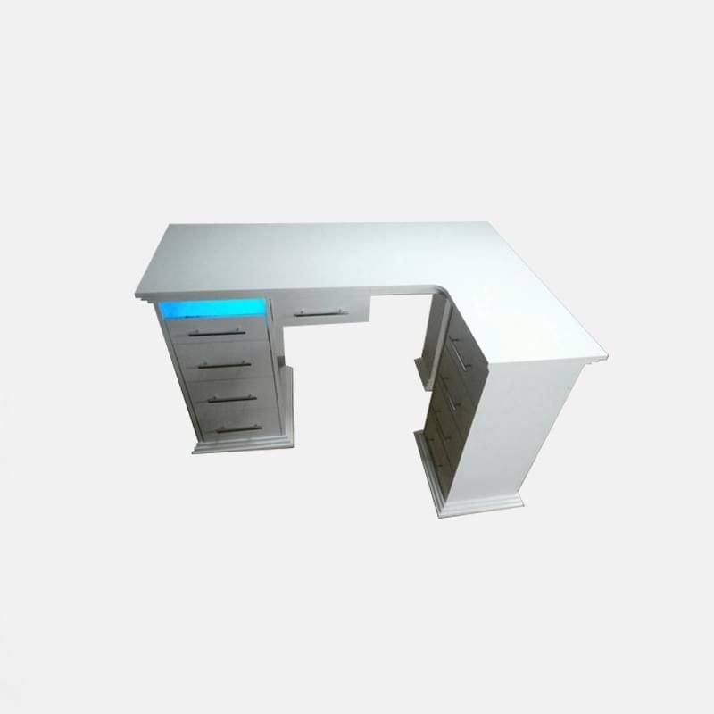 Главная особенность маникюрного стола Time – его угловая форма. За счет этого столик занимает относительно немного места и является более практичным, чем аналоги. В мастера в распоряжении будет большая столешница, две вместительные тумбы и дополнительный выдвижной ящик.