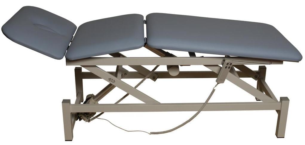 В отличие от 2-секционной версии, эта кушетка поставляется с разделённой основной частью. Она оборудована вторым электрическим мотором для управления средней частью. Стандартная модель может быть расширена добавлением отверстия для лица.