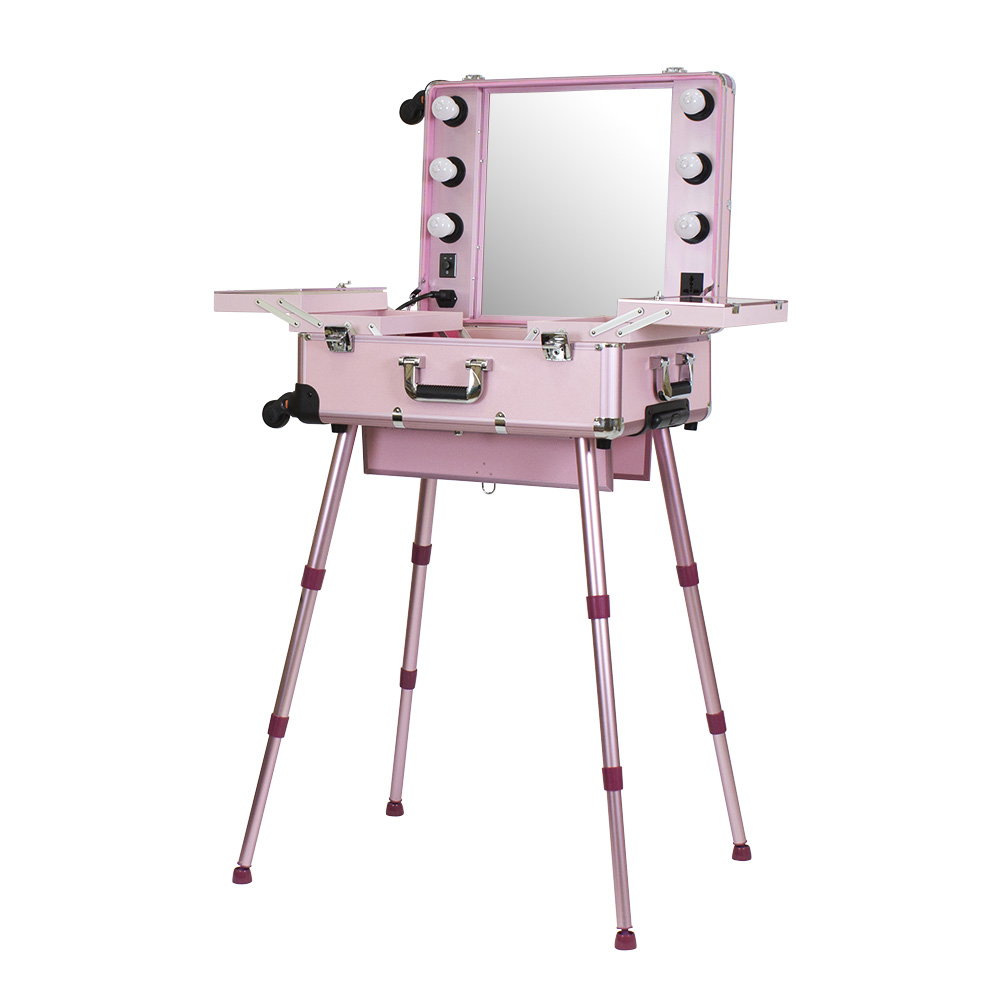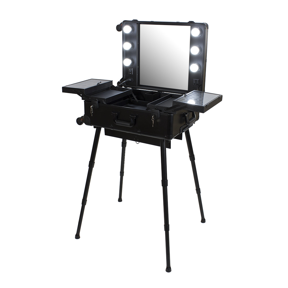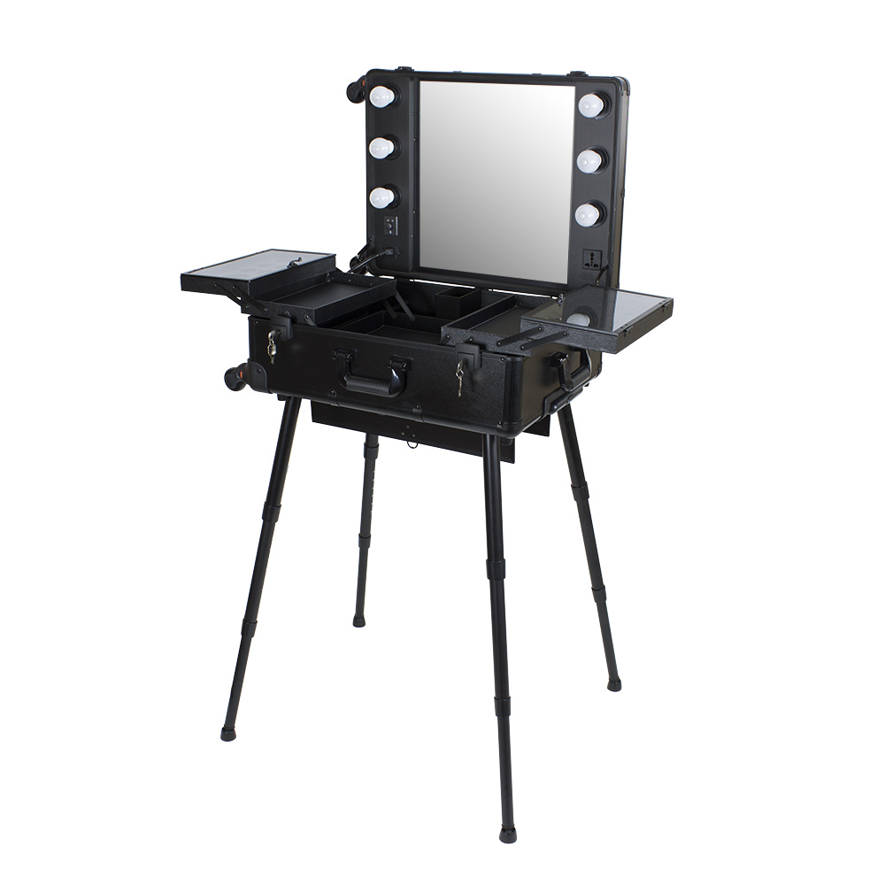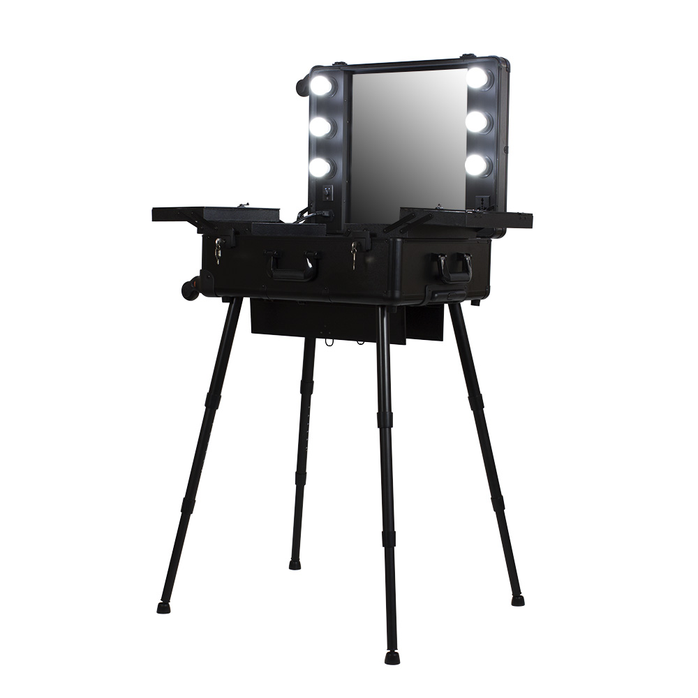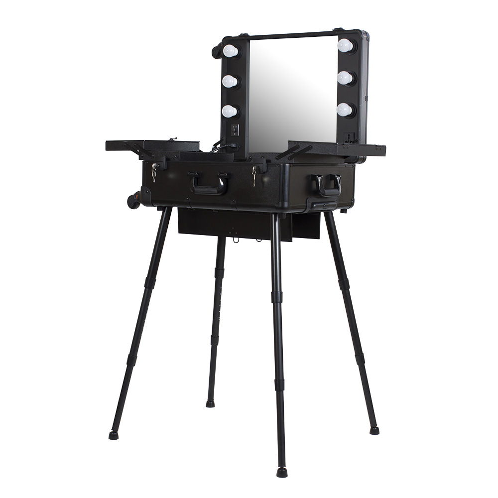Мобильная студия визажиста VZ-210 поможет создать профессиональный уголок в любом салоне красоты или на выездном мероприятии. Студия представляет собой компактный столик с раздвижными полочками, зеркало и освещение из 6 ламп. В полочках предусмотрено специальное пространство для хранения косметики и инструмента, на верхних полках есть место для хранения палитры теней. Удобные телескопические ножки обеспечивают установку студии на любой поверхности. Высоту треноги можно регулировать. Студия визажиста собирается в компактный чемодан на колёсиках с удобной выдвижной ручкой. Поэтому её легко транспортировать, что делает её незаменимым помощником для выездной работы. Для дополнительной безопасности кейс закрывается на два ключа. Оборудование для визажистов изготовлено из ПВХ. Этот надёжный качественный материал защитит содержимое кейса от воздействия влаги и света. В открытую верхнюю часть встроено достаточно большое зеркало с гладкой поверхностью. Оно достаточно прочно и устойчиво к умеренным механическим повреждениям. Зеркальное полотно точно передаёт отображение, не искажая его. Рабочее место идеально освещается при помощи встроенных LED ламп по периметру зеркала. Шнур питания и розетка для электроприборов встроены в корпус кейса. Профессиональная студия визажиста VZ-210 дополнит интерьер любого современного салона красоты, а также станет незаменимым помощником в работе на конкурсах, модных показах и других выездных мероприятиях.