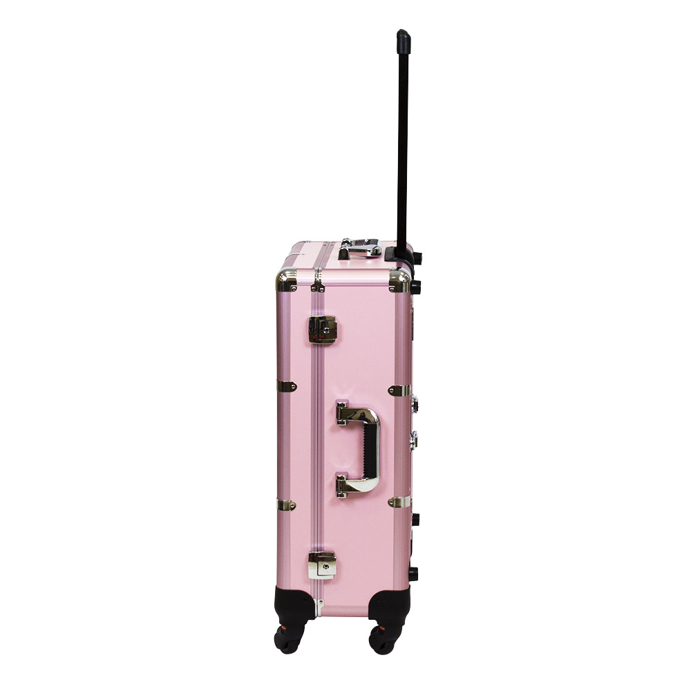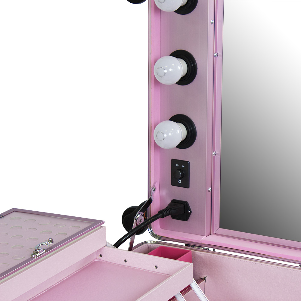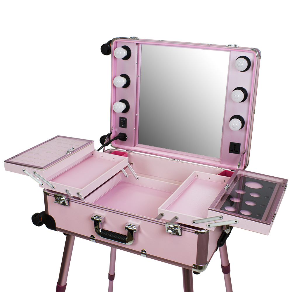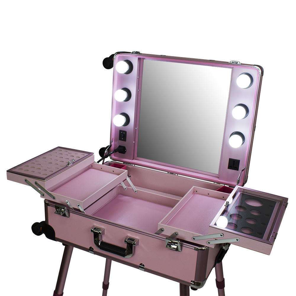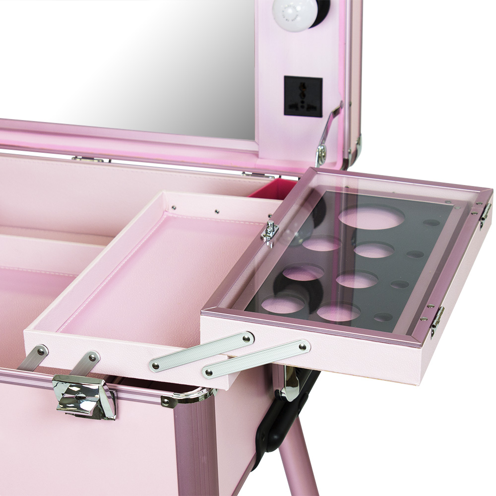 Мобильная студия визажиста VZ-210 поможет создать профессиональный уголок в любом салоне красоты или на выездном мероприятии. Студия представляет собой компактный столик с раздвижными полочками, зеркало и освещение из 6 ламп. В полочках предусмотрено специальное пространство для хранения косметики и инструмента, на верхних полках есть место для хранения палитры теней. Удобные телескопические ножки обеспечивают установку студии на любой поверхности. Высоту треноги можно регулировать. Студия визажиста собирается в компактный чемодан на колёсиках с удобной выдвижной ручкой. Поэтому её легко транспортировать, что делает её незаменимым помощником для выездной работы. Для дополнительной безопасности кейс закрывается на два ключа. Оборудование для визажистов изготовлено из ПВХ. Этот надёжный качественный материал защитит содержимое кейса от воздействия влаги и света. В открытую верхнюю часть встроено достаточно большое зеркало с гладкой поверхностью. Оно достаточно прочно и устойчиво к умеренным механическим повреждениям. Зеркальное полотно точно передаёт отображение, не искажая его. Рабочее место идеально освещается при помощи встроенных LED ламп по периметру зеркала. Шнур питания и розетка для электроприборов встроены в корпус кейса. Профессиональная студия визажиста VZ-210 дополнит интерьер любого современного салона красоты, а также станет незаменимым помощником в работе на конкурсах, модных показах и других выездных мероприятиях.