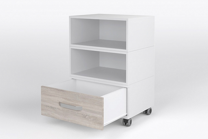 Универсальная тумба "Bingo" - оснащена двумя глубокими нишами и одним выкатным ящиком. Однако набор и расположение секций можно изменить – достаточно купить дополнительные элементы и установить их так, как удобно. Корпус и ящики выполнены из плит ЛДСП.