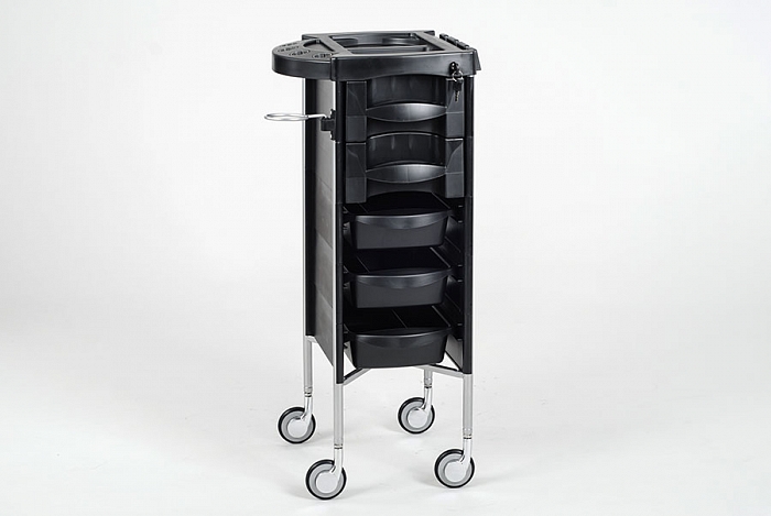 Парикмахерская тележка "QA0006" - выполнена из хромированной стали и пластика, устойчивого к воздействию косметических средств. Для хранения инструментов предусмотрены пять выдвижных ящиков, верхние запираются на замок. Столешница поделена на секции и оборудована навесной панелью для парикмахерских инструментов.