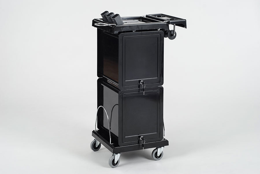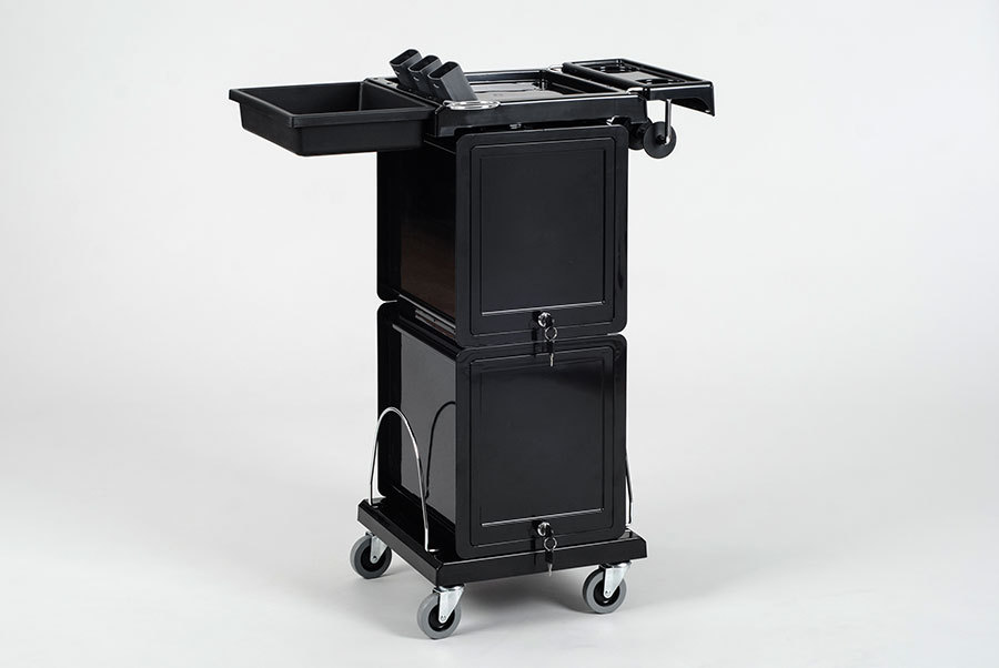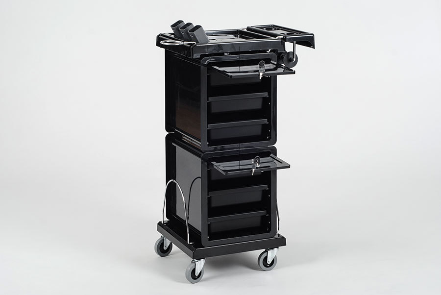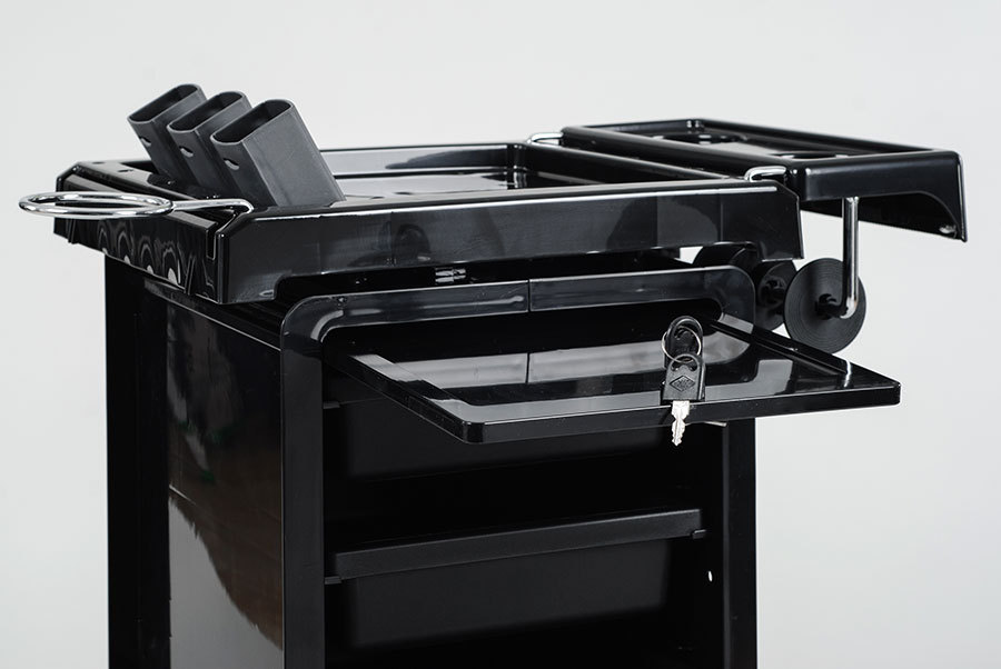 Компактная многофункциональная парикмахерская тележка "QA0013" выполнена из прочного пластика, стойкого к воздействию косметических красок, а прорезиненные колеса обеспечивают легкое и бесшумное передвижение тележки. Столешница поделена на секции и имеет специальные стаканы для горячих ножниц и выпрямителей. Тележка оснащена внешним держателем для фена и специальным держателем для фольги. Для хранения инструментов предусмотрены шесть выдвижных ящиков, которые, при необходимости, легко вынимаются и надежно фиксируются на столешнице. Секции с ящиками запираются на ключ. Для каждой секции предусмотрен свой ключ, что делает возможным использование тележки QA0013 сразу на два рабочих места парикмахера. На нижней платформе можно разместить высокие емкости, хромированные бортики надежно фиксируют бутыли и не позволяют им упасть.