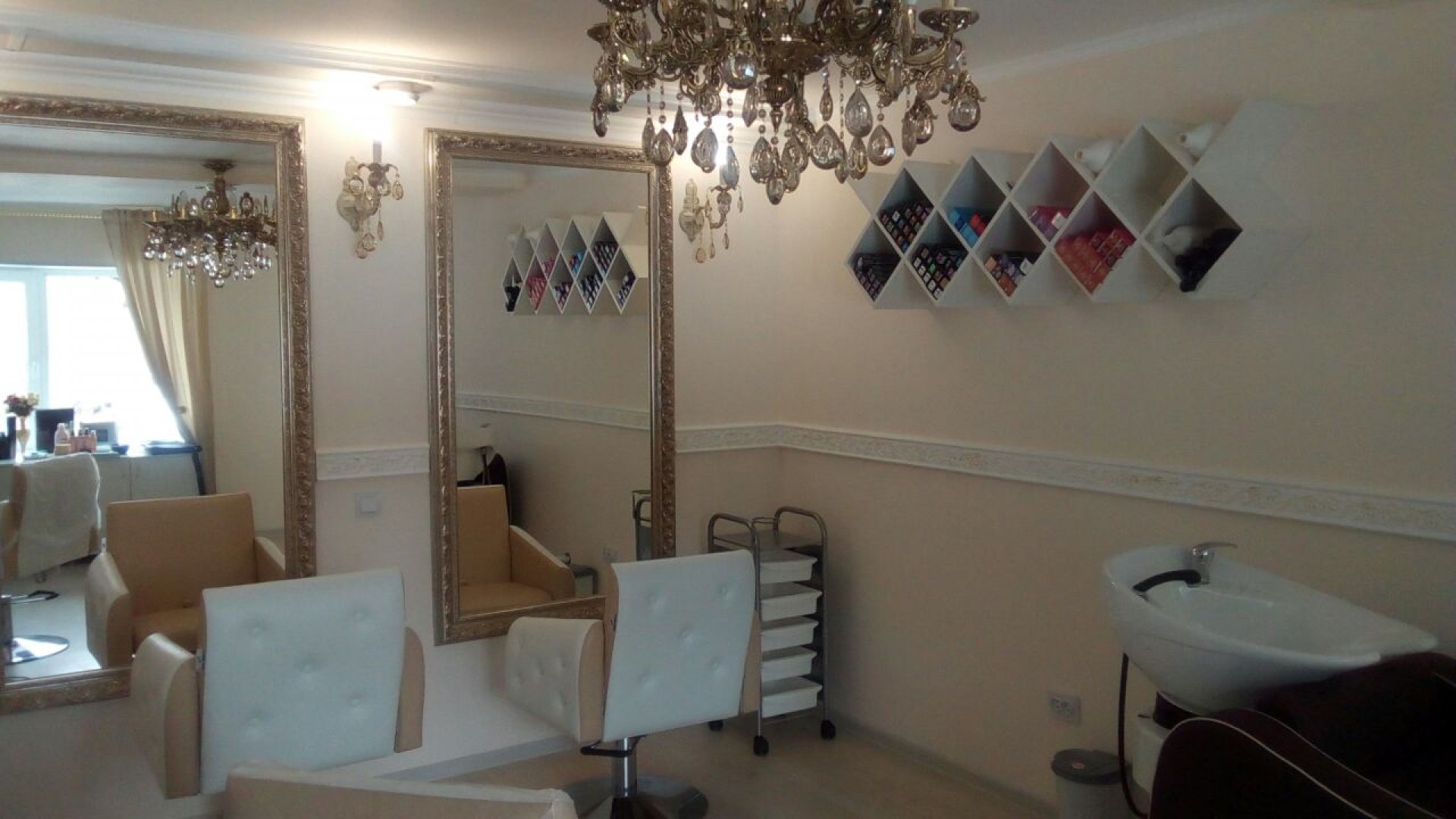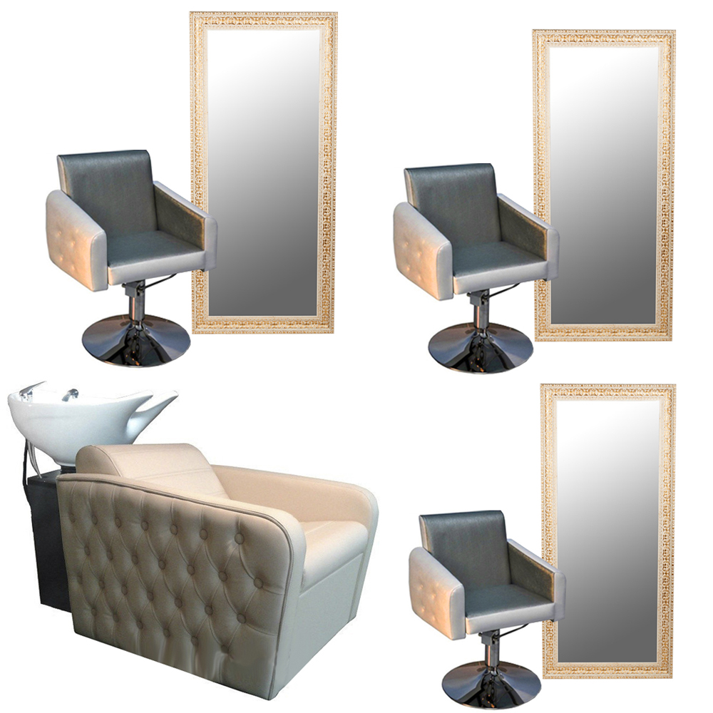 Парикмахерский комплект «Симфония II» предназначен для полноценного обустройства парикмахерской зоны для нескольких мастеров. В комплект входит три парикмахерских кресла, три односторонних вертикальных зеркала в багетных рамах и одна мойка, комплектующаяся креслом. Обивка кресел выполнена из искусственной кожи, подлокотники и спинка декорированы каретной стяжкой.