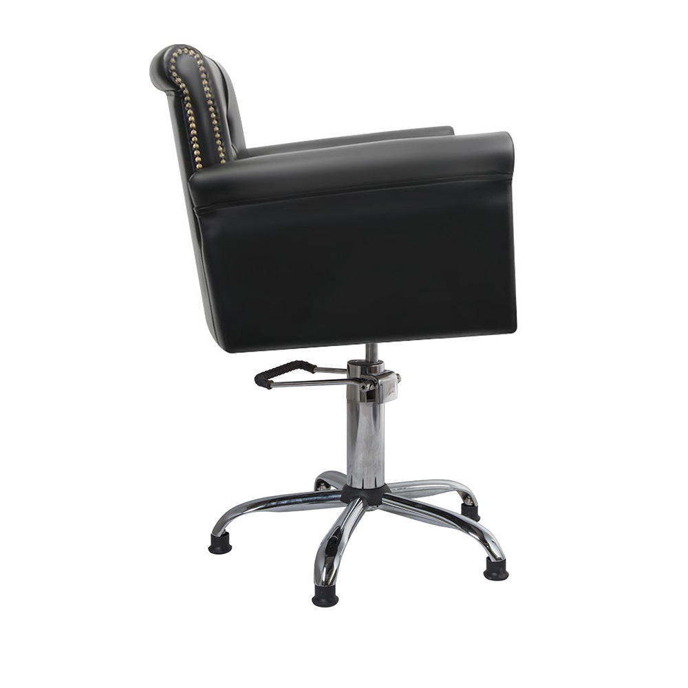 Черный цвет будет хорошо смотреться в любом помещении, широкая спинка и сидение подарят комфорт клиентам, а мастера смогут регулировать высоту с помощью гидравлического механизма. Одна из особенностей – каретная стяжка во внутренней части спинки. А пятилучье в основании делает кресло устойчивым.