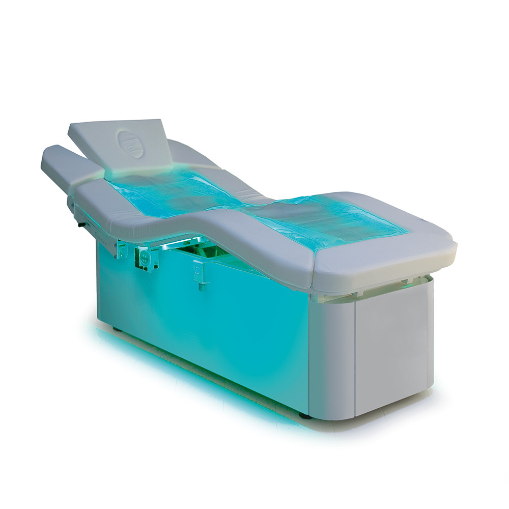 СПА кушетка "MLW AMPHIBIA" - позволяет реализовать комплексную концепцию лечебных процедур со всеми преимуществами новейших технологий. Особенностью этой кушетки является уникальное разнообразие поверхности ложа: центральная часть может быть заменена на наполненную водой обивку. Благодаря этому, кушетка несомненно приобретает все комфортные преимущества водяной кровати, что позволяет полностью расслабить клиента, подарив ему незабываемые минуты умиротворения. Встроенные коврики с подогревом помогают наслаждаться приятным теплом. Нижняя сторона деревянной панели оснащена светодиодными лентами, которые создают исключительный визуальный эффект и неповторимую атмосферу комфорта. Для процедур цветотерапии, дополнительная подсветка расположена по бокам основания кушетки и под водяными подушками.