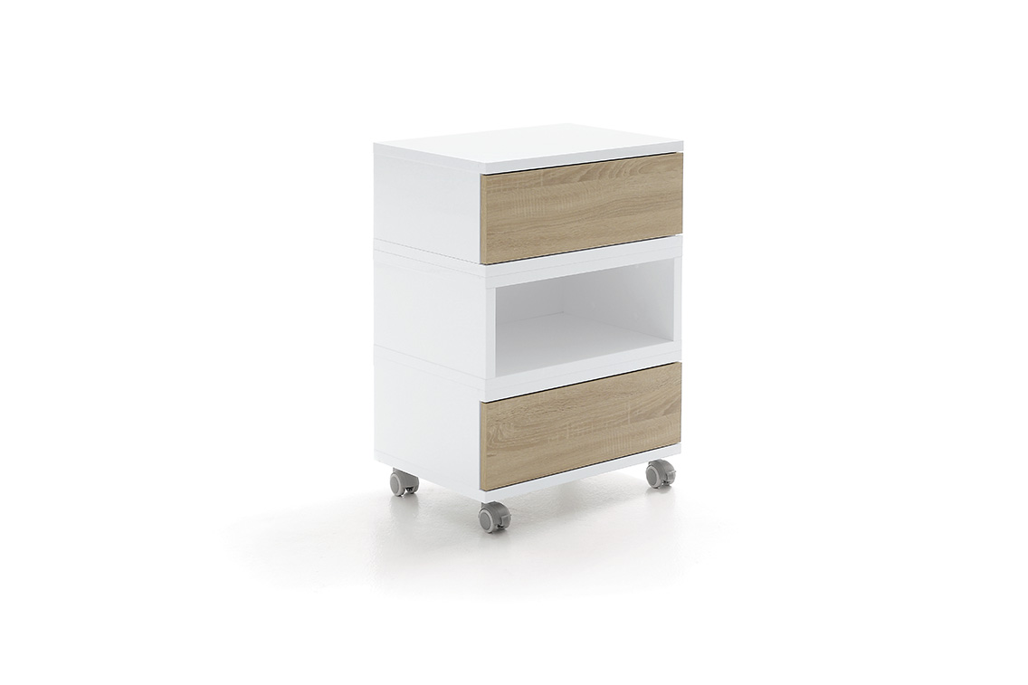 Ящики доступны в трех вариантах отделки: натуральный венге, белая лиственница, дуб бардолино. Цвет каркаса остается неизменным – белым. Благодаря использованию базовых цветов такая модель прекрасно впишется в любой интерьер.