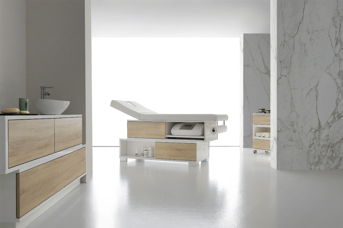 СПА-тележка «Swing» выполнена из белого глянцевого меламина. Данный материал отличается высокой прочностью, сопоставимой с прочностными характеристиками деревянного шпона. Модель имеет два выдвижных ящика и расположенную между ними открытую полку. Все отсеки вместительные и подходят для хранения не только СПА-средств, но и полотенец. Благодаря наличию колес тележку можно легко перемещать.