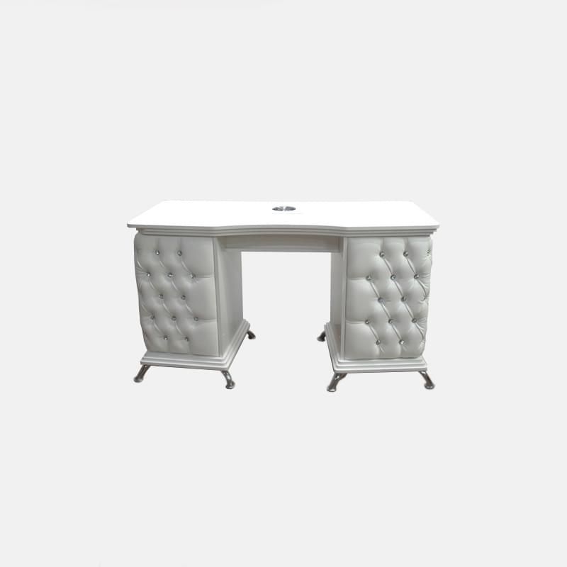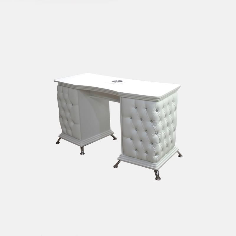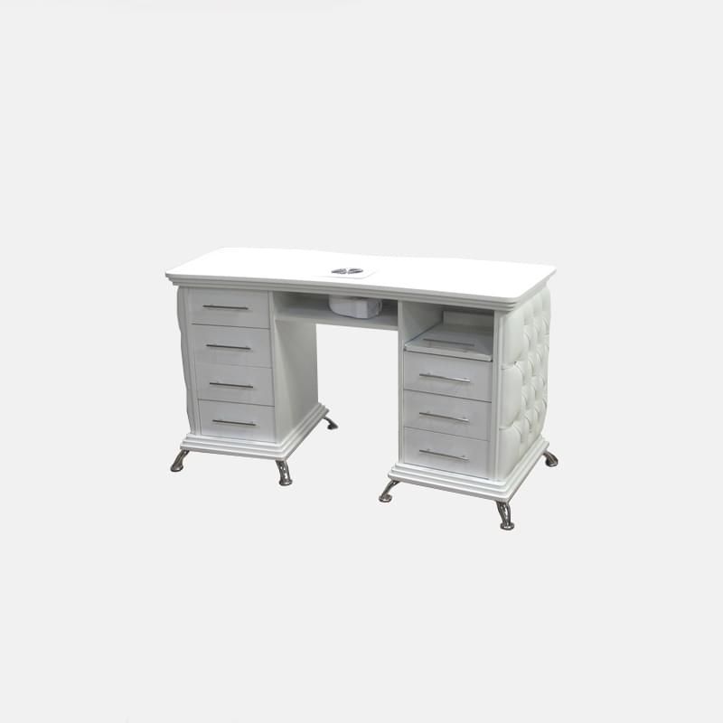 Стильный маникюрный стол Dull выполнен в классическом дизайне и отличается большой вместительностью. С двух сторон расположены тумбы с выдвижными ящиками, где можно разместить все для работы. Посредине – полка, куда мы можем установить производительную вытяжку, если данное решение актуально для вас.