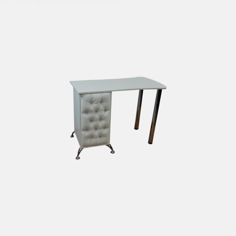 Несмотря на компактные габариты площадь столешницы позволяет разместить здесь все необходимое для работы – вытяжку, лампу, подставку для лаков и прочее. А тумба на 4 выдвижных ящика – удобное место для хранения различных средств, инструментов и прочего. Места достаточно. Вы можете сами выбрать размеры и расцветку столика. В том числе каретной стяжки на фронтальной стороне.