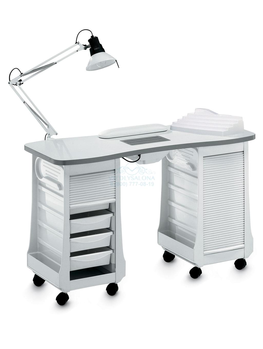 Маникюрный стол с вытяжкой, двумя тумбами и белой ламинированной столешницей. Тумбы пластиковые на колесах с выдвижными ящиками. Варианты цвета тумбы: белый, серый, черный. В комплекте: лампа, подушка для маникюра, подставка для лаков. Размер: 122х48х74