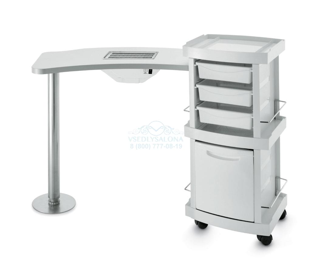 Маникюрный стол с одной тумбой, столешница из ламинированного ДСП, тумба из пластика с выдвижными ящиками, на колесах. В комплекте: вытяжка, лампа, подушка маникюрная, подставка под лаки. Цвет: белый. Размер: 123х55x85