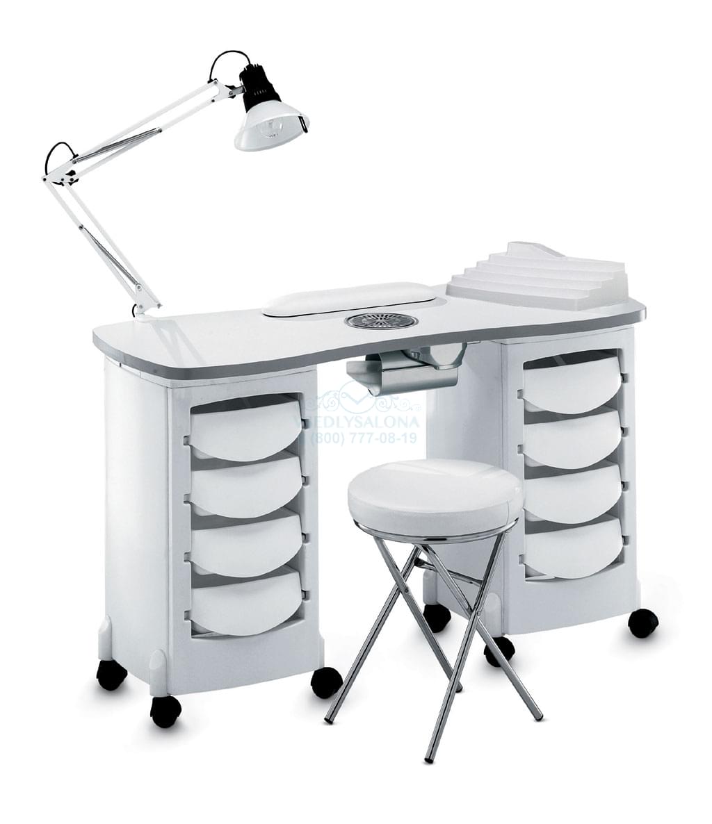 Маникюрный стол с двумя тумбами, столешница белая ламинированная, тумбы пластиковые с выдвижными ящиками, на колесах. В комплекте: лампа, подушка маникюрная, подставка под лаки. Цвет тумбы: белый, серый. Размер: 122х48x75