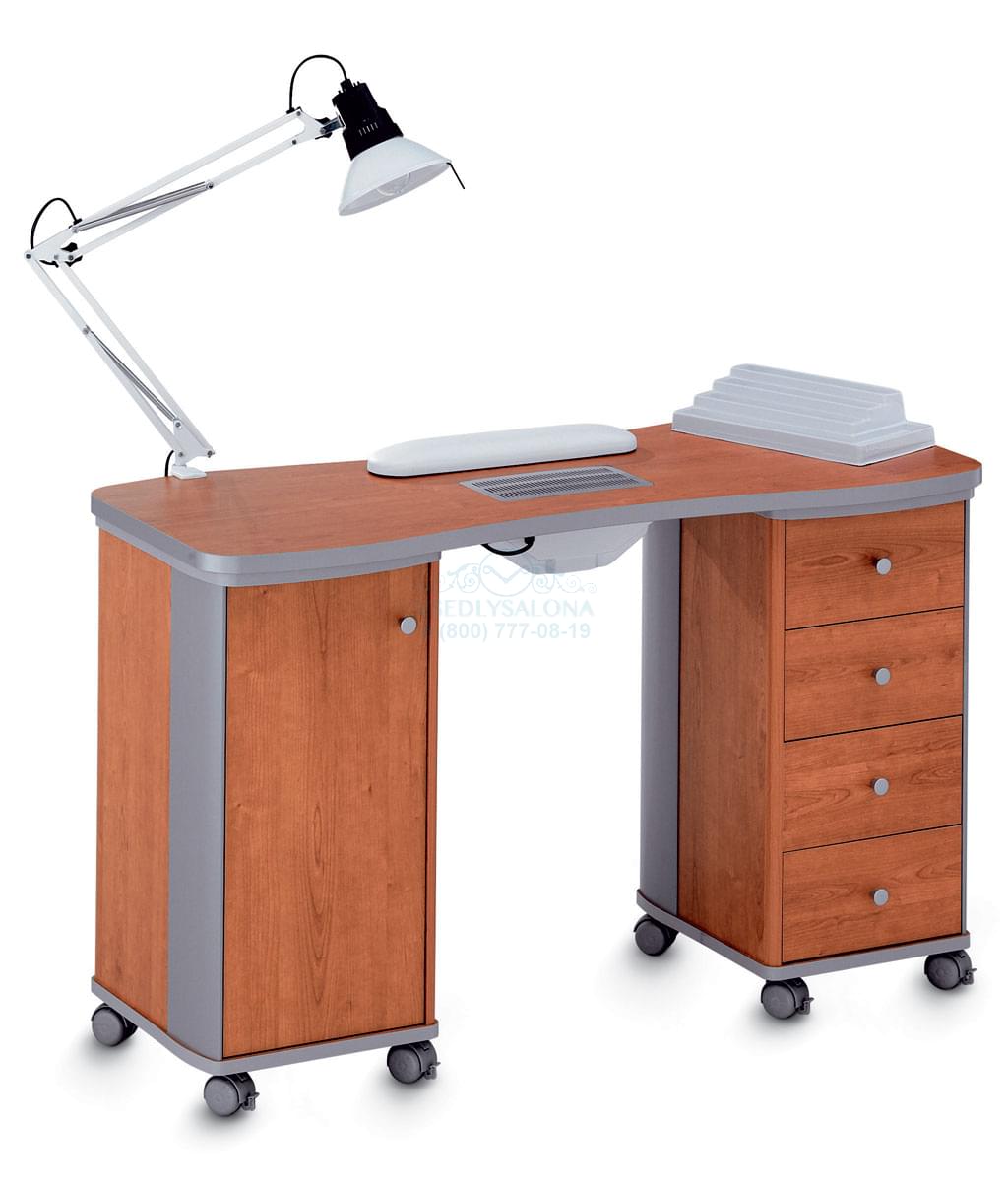 Маникюрный стол с вытяжкой, двумя тумбами и ламинированной столешницей белого или вишневого цвета. Тумба выполнена из ДСП, оснащена четырьмя выдвижными ящиками и колесами. В комплекте: лампа, подушка для маникюра, подставка для лаков. Размер: 122х47х74