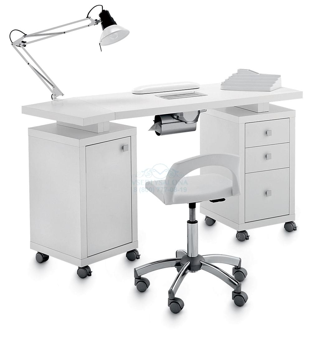 Маникюрный стол с вытяжкой, двумя тумбами и ламинированной столешницей. Тумбы выполнены из ДСП, оснащены тремя выдвижными ящиками и колесами. Варианты цвета: белый, венге. В комплекте: лампа, подушка для маникюра, подставка для лаков. Размер: 148x56x79
