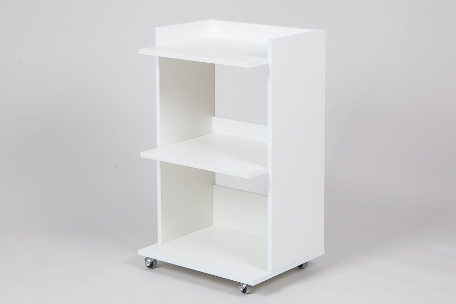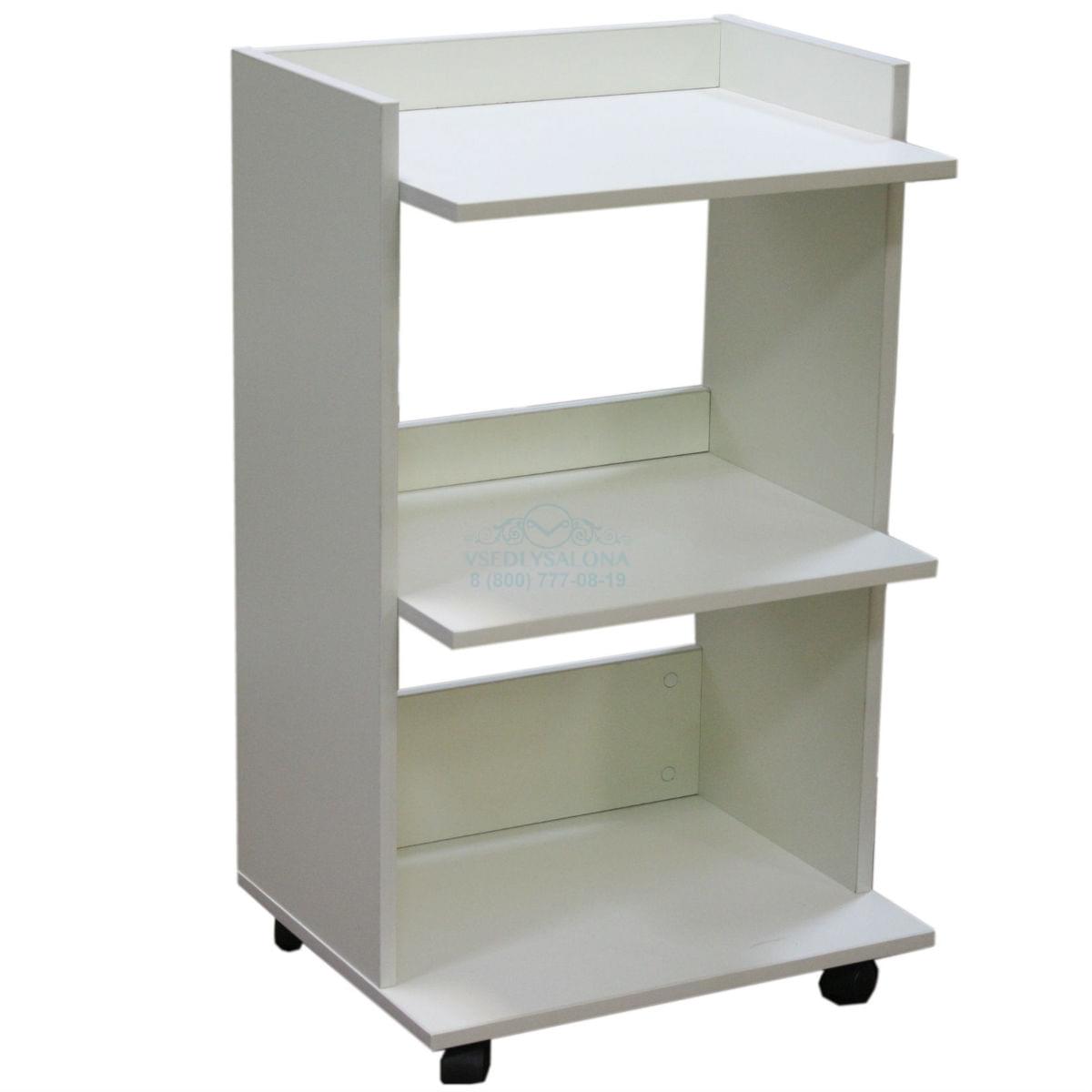 Столик косметолога три полки на колесах. Удобный косметологический столик-тележка с тремя полкапи, ограниченными бортиками с трех сторон. Расстояние между полками 33 см. позволяет ставить высокие флаконы с косметологическими средствами. Влагостойкое ламинированное ДСП порзволяет протирать и обрабатывать столик дез средствами.