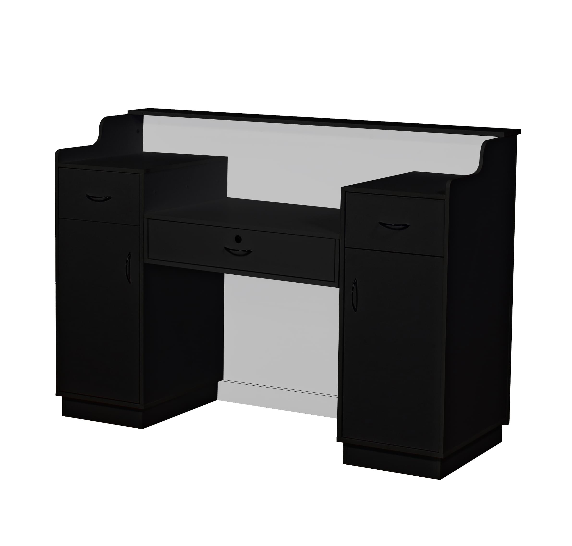 Стойка оснащена столешницей с ящиком на замке и двумя тумбами. Столешница может располагаться на одном уровне с тумбами или ниже них. Каждая из тумб состоит из выдвижного ящика и отделения с распашной дверцей. В наличии стойки из ДСП черного и белого цветов, под заказ возможно изготовление в любом цвете и размере.