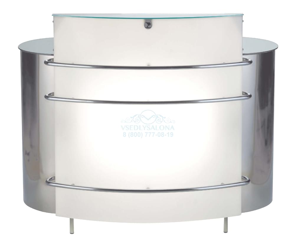 Ресепция округлой формы, выполнена из металла, фасад из оргстекла с подсветкой. Столешница из стекла, снизу два выдвижных ящика цвета венге и полка. Ножки металлические.