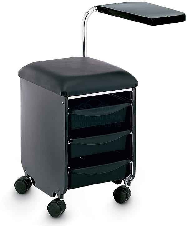 Стойка сделана в черных тонах из прочного пластика, имеет три выдвижных ящика для хранения личных вещей, размер – небольшой. Но главное – это специальная полка, высоту которой можно регулировать и настраивать под каждого клиента. Чтобы стойку было проще перемещать, изготовитель предусмотрел колесики.