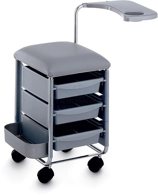 Основание стойки выполнено из прочного пластика, который легко очищается. В данной модели предусмотрено три выдвижных ящика, открытое отделение и одна полка, которую можно настраивать по высоте. Чтобы было проще передвигать стойку, производитель предусмотрел колесики, что значительно упрощает использование в любых условиях.