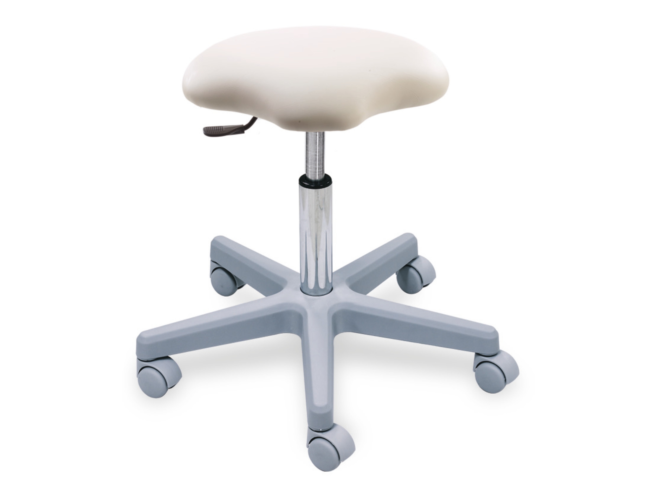 Низкий стул мастера "019 PEDI" с бесшовной сидушкой в форме седла, оснащен пластиковым пятилучьем на колесах и газлифтом для регулировки высоты. Посадочное место – в форме седла.