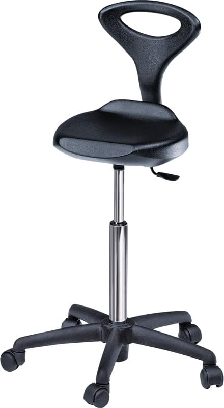 Стул для мастера выполнен из пенополиуретана, основание пластиковое пятилучье черного цвета на колесах, регулировка высоты пневматическая. Возможен вариант без спинки. Вариант цвета сиденья под заказ – черный, синий.