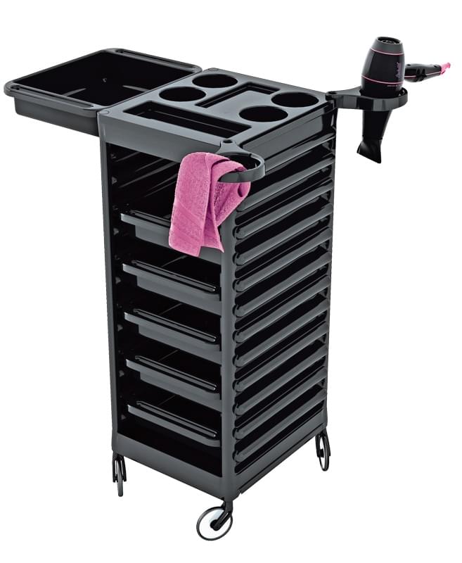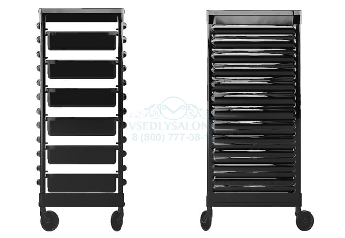 Парикмахерская тележка Т-30 оснащена глубокими и вместительными ящиками для парикмахерских принадлежностей, а также фенодержателем для еще большего удобства работы. Она выполнена в классическом черном цвете, что делает ее универсальной моделью практически для любой современной парикмахерской или барбершопа.